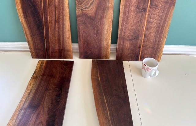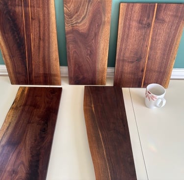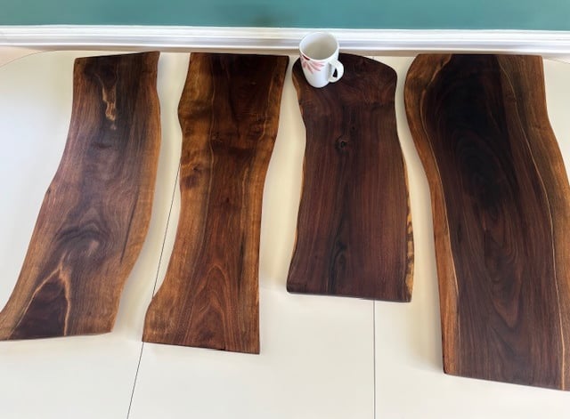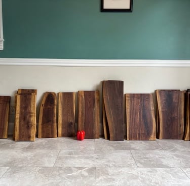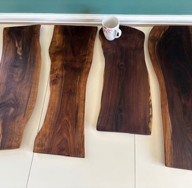 Medium black walnut serving boards 17"-24"long x 8"-12"wide live edge All boards have integrated recessed handles and a minimum five coats of hand rubbed Tung and citrus oil finish. $85.00