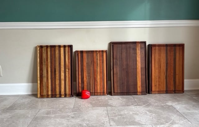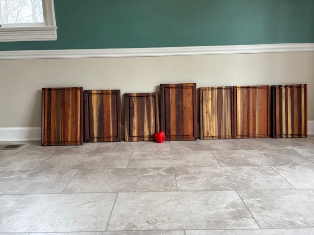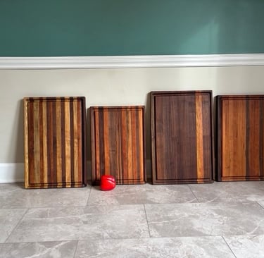 Reversible cutting boards with mostly black Walnut and black Cherry, there may be a piece or two of Ash or Mulberry. 16"-18" long x 12"-14" wide x1"-1.5" thick $125.00